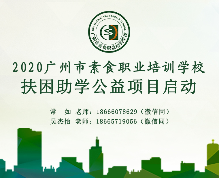 为更好更快更多地培养素食专业人才,搭建社会共同发心平台,广州素食学校特推出“扶困助学公益项目”,联动社会公益组织、募集公益资金,扶助全国52个贫困地区失学青少年以及其他社会有志于素食事业的贫困学子完成专业培训学习,并统一保障安排就业,或进行扶困支持创业。特邀社会各界共同参与。